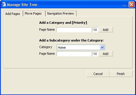 Simply enter the name of your new page, click Add, and click Finish. If you wish to add multiple pages add them BEFORE clicking "Finish" -- only click "Finish when you're ready to close the window. |